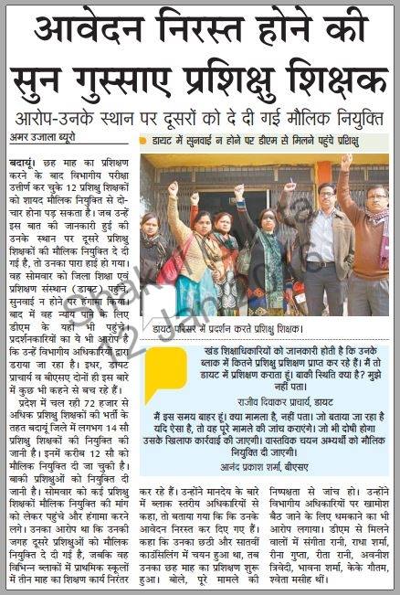 बदायूं। छह माह का प्रशिक्षण करने के बाद विभागीय परीक्षा उत्तीर्ण कर चुके 12 प्रशिक्षु शिक्षकों को शायद मौलिक नियुक्ति से दो-चार होना पड़ सकता है। जब उन्हें इस बात की जानकारी हुई की उनके स्थान पर दूसरे प्रशिक्षु शिक्षकों की मौलिक नियुक्ति दे दी गई है, तो उनका पारा हाई हो गया। वह सोमवार को जिला शिक्षा एवं प्रशिक्षण संस्थान (डायट) पहुंचे, सुनवाई न होने पर हंगामा किया। बाद में वह न्याय पाने के लिए डीएम के यहां भी पहुंचे। प्रदर्शनकारियों का ये भी आरोप है कि उन्हें विभागीय अधिकारियों द्वारा डराया जा रहा है। इधर, डायट प्राचार्य व बीएसए दोनों ही इस बारे में कुछ भी कहने से बच रहे हैं।