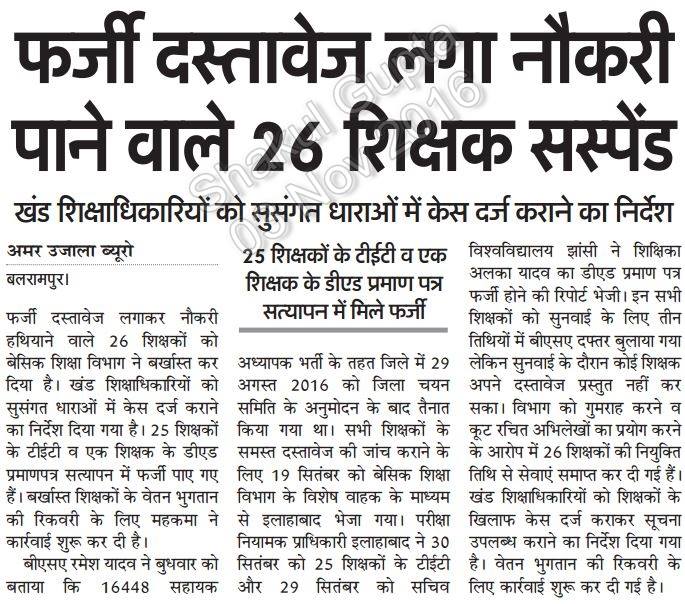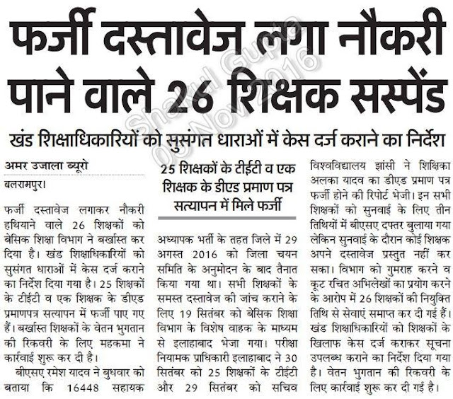 UPTET SARKARI NAUKRI   News -बलरामपुर-26 बेसिक शिक्षक बर्खास्त किए गए,